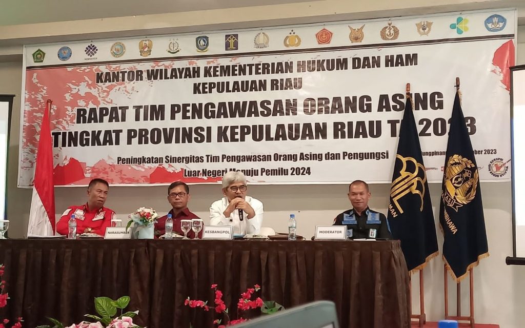 BAKESBANGPOL KEPRI – Rapat Tim Pengawasan Orang Asing Tingkat Provinsi Kepri Tahun 2023 dengan Tema” Peningkatan Sinergitas Tim Pengawasan Orang Asing dan Pengungsi Luar Negeri Menuju Pemilu 2024 yang dilaksanakan pada Rabu (22/11/2023) di Hotel Aston Kota tanjungpinang, KEPRI. Turut hadir Kakanwil kumham diwakili Bapak Adi Purwanto, Kabid Zinfokim Kanwil Kepri, Kadiv Imigrasi diwakili Bapak Irwanto Kabid Intelijen dan Penindakan Keimigrasian, Kepala Badan Kesatuan Bangsa dan Politik Prov. Kepri diwakili Bapak Abdul Rifani Kabid Kewaspadaan Nasional dan Penanganan Konflik, dan Tim Pora Provinsi Kepulauan Riau.