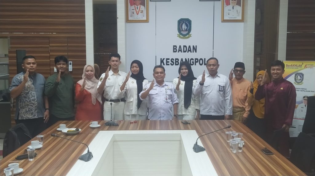 BAKESBANGPOL KEPRI – Kepala Badan Kesbangpol Provinsi Kepri Dr. Darson, S.Pd, M.Si di dampingi Kepala Bidang Idwasbang Yunus Yanuard, S.SiT, M.A.P menyematkan pin Purna Paskibraka Duta Pancasila kepada anggota Paskibraka Provinsi Kepri Tahun 2022 di ruang rapat Kesbangpol Prov. Kepri, Jum’at (10/01/2024).
