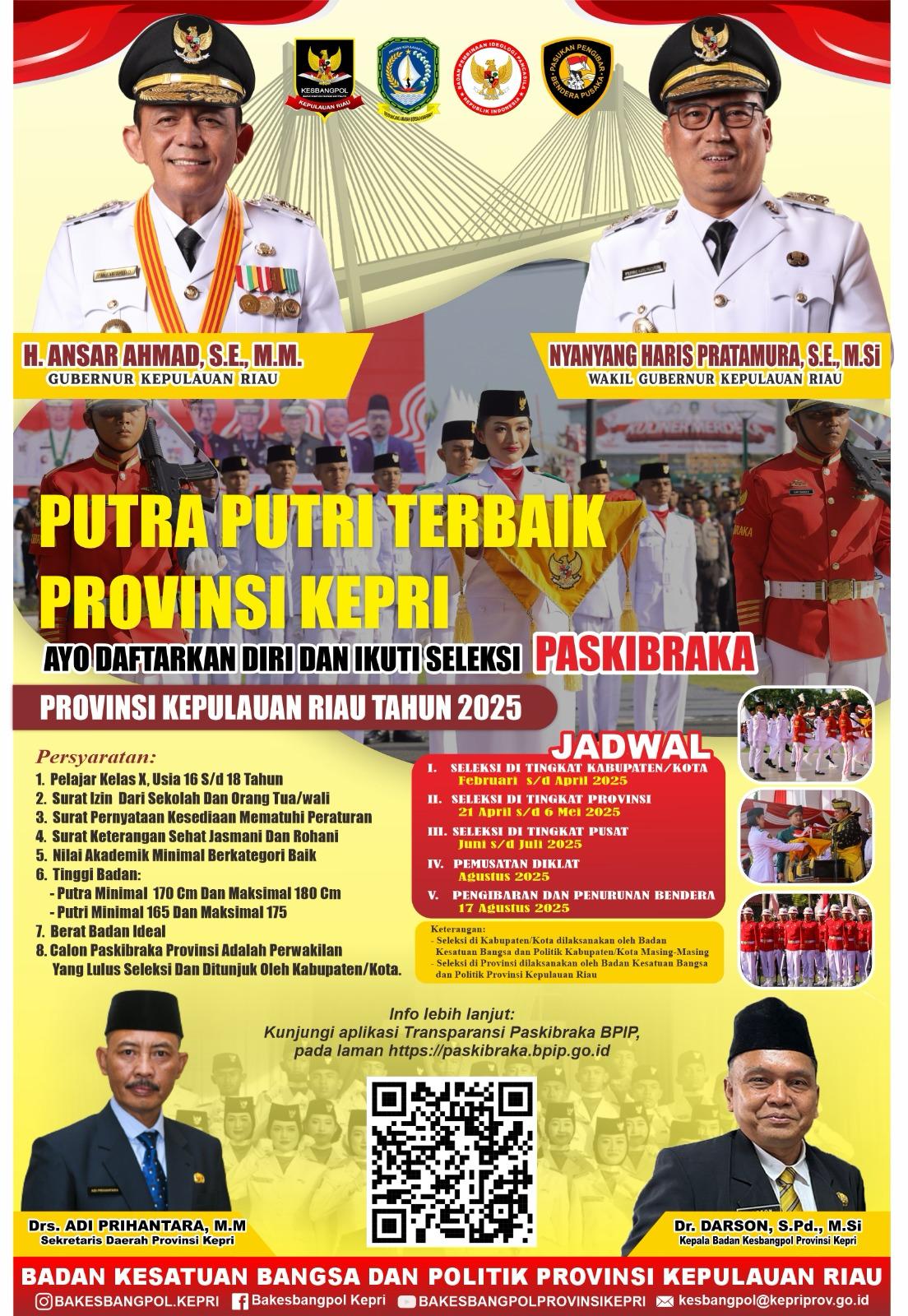 Seleksi Paskibraka Provinsi Kepri dan Tingkat Nasional Akan Dibuka Secara Online Mulai 21 April 2025 Berita Terkini, Bidang Bidang Ideologi, Wawasan Kebangsaan dan Karakter Bangsa, Sekretariat Bakesbangpol • Kesekretariatan Bakesbangpol Kepri • 16/04/2025 • bakesbangpolkepri, kepulauanriau, paskibraka2025 • Tinggalkan Komentar Berita Terkini, Bidang Bidang Ideologi, Wawasan Kebangsaan dan Karakter Bangsa, Sekretariat Bakesbangpol