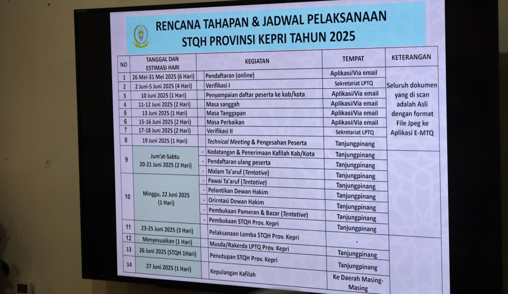 Pelaksanaan STQH ke XI tingkat Provinsi Kepri Tahun 2025 dijadwal digelar pada 21-25 Juni 2025, dimajukan dari jadwal semula 22-26 Juni.