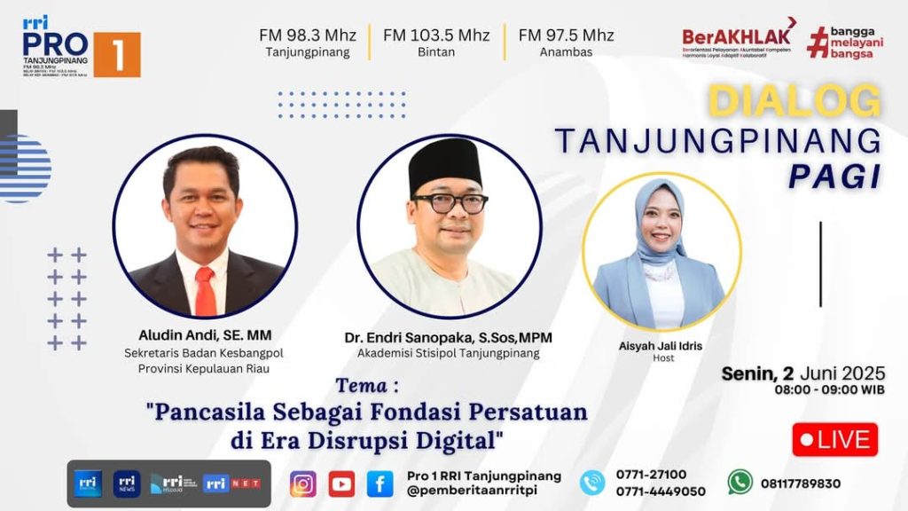Home » Berita Terkini » Berita Terkini » Sekretaris Bakesbangpol Kepri Jadi Narasumber Dialog Interaktif RRI Tanjungpinang dengan Tema Pancasila sebagai Fondasi Persatuan di Era Disrupsi digital