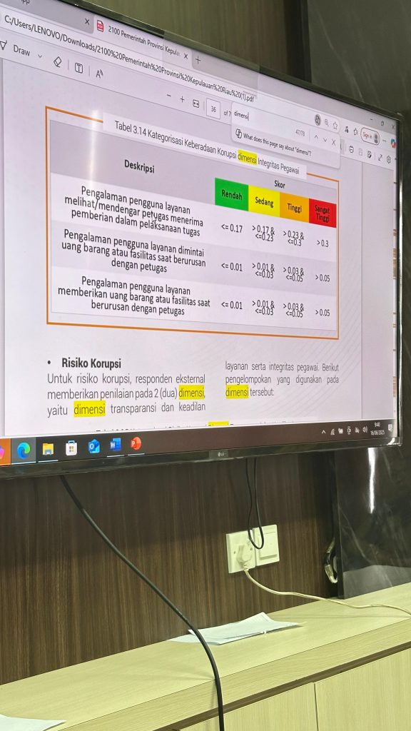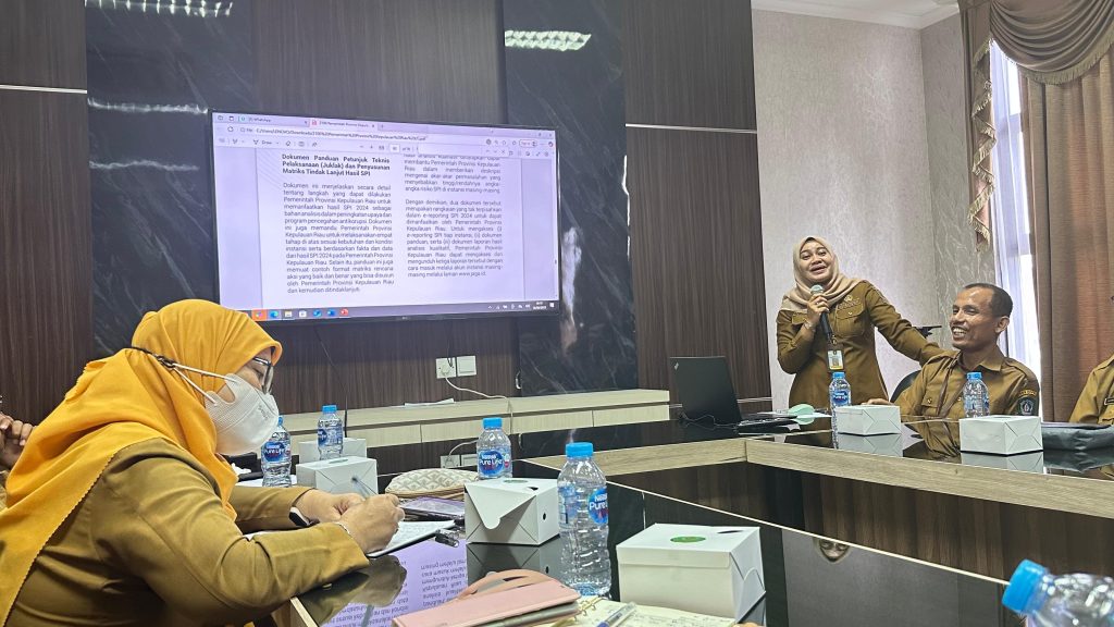 BAKESBANGPOL KEPRI – Inspektorat Daerah Provinsi Kepulauan Riau memaparkan hasil Survey Penilaian Integritas (SPI) KPK RI, di Lingkungan Pemerintah Provinsi Kepulauan Riau Tahun 2024, pada rapat pembahasan upaya tindak lanjut hasil Survei Penilaian Integritas yang dilaksanakan pada hari Senin Tanggal 16 Juni 2025 bertempat di Ruang Rapat Lantai III Inspektorat Daerah, Provinsi Kepulauan Riau.