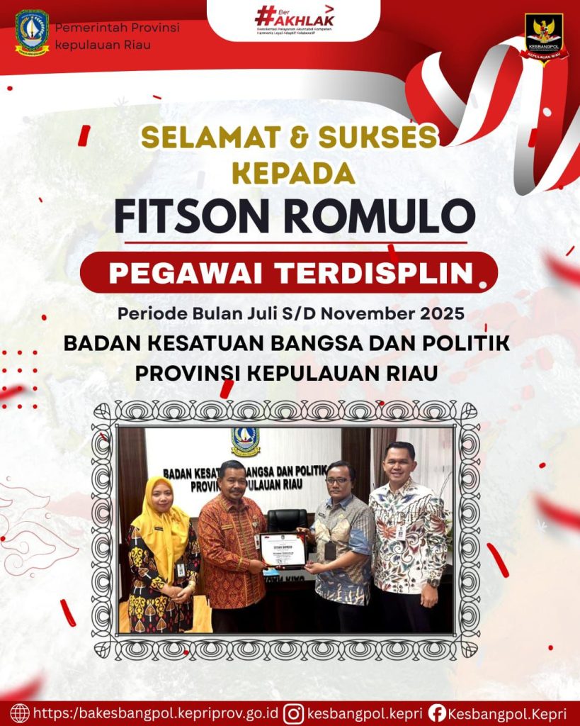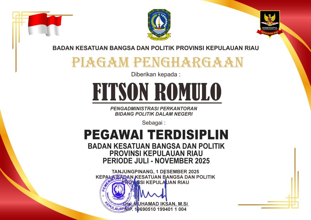 BAKESBANGPOL KEPRI – Kepala Badan Kesatuan Bangsa dan Politik Provinsi Kepulauan Riau, Muhamad Iksan menyerahkan Piagam Penghargaan “PEGAWAI TERDISIPLIN” Badan Kesatuan Bangsa dan Politik Provinsi Kepulauan Riau Periode Bulan Juli s/d November2025. Acara Penyerahan dilaksanakan di Ruang Kerja Kepala Badan pada Hari Kamis 4/12/2025.