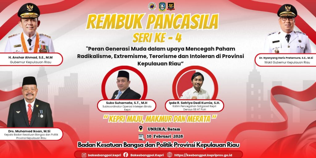 Kegiatan yang ditaja Badan Kesatuan Bangsa dan Politik (Kesbangpol) Kepri menjadi ruang strategis untuk memperkuat peran generasi muda dalam menjaga ideologi bangsa. Rembuk Pancasila seri ke-4 dengan mengusung tema “Peran Generasi Muda dalam Upaya Mencegah Paham Radikalisme, Ekstremisme, Terorisme, dan Intoleransi di Provinsi Kepulauan Riau”.