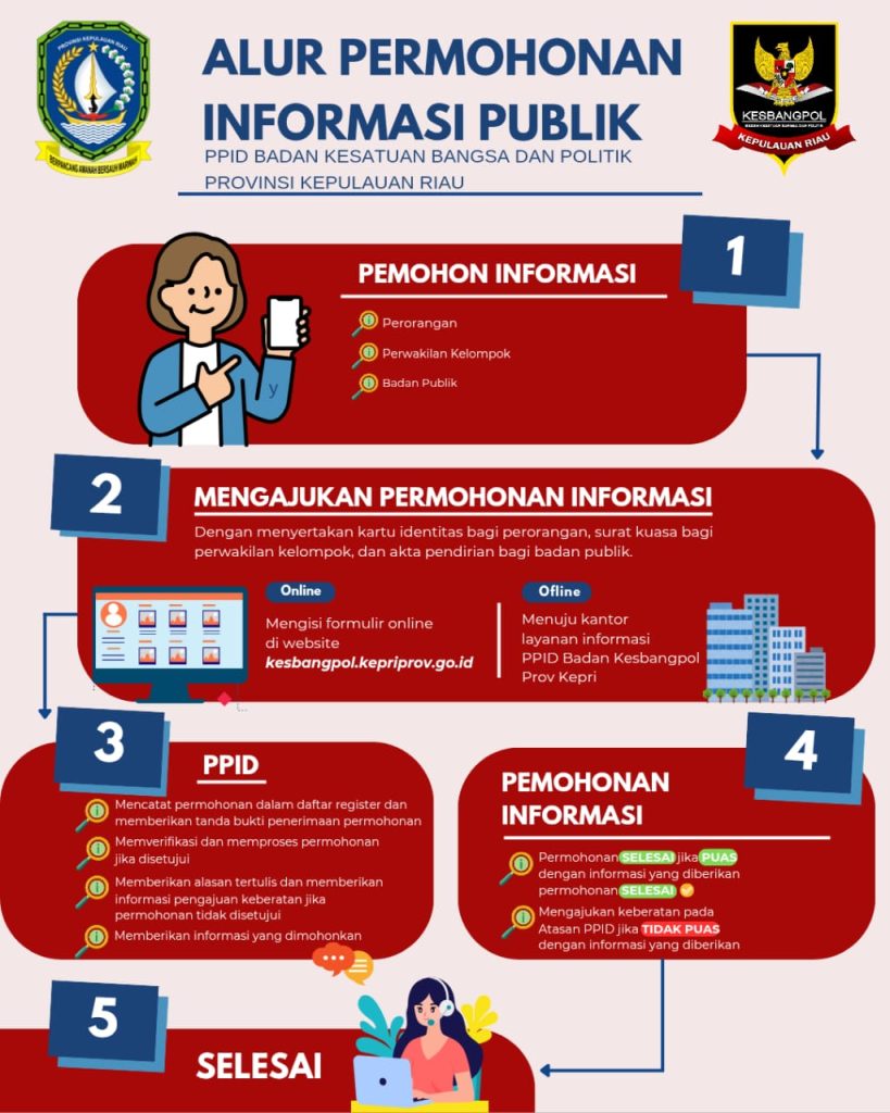 - Pemohon informasi datang ke desk layanan informasi mengisi formulir permintaan informasi dengan melampirkan foto copy KTP pemohon dan pengguna informasi, bagi lembaga publik/ormas dilengkapi foto copy akta pendirian, surat keterangan terdaftar di Badan Kesatuan Bangsa Dan Politik Provinsi Kepulauan Riau/setempat, surat keterangan domisili lembaga publik/ormas.